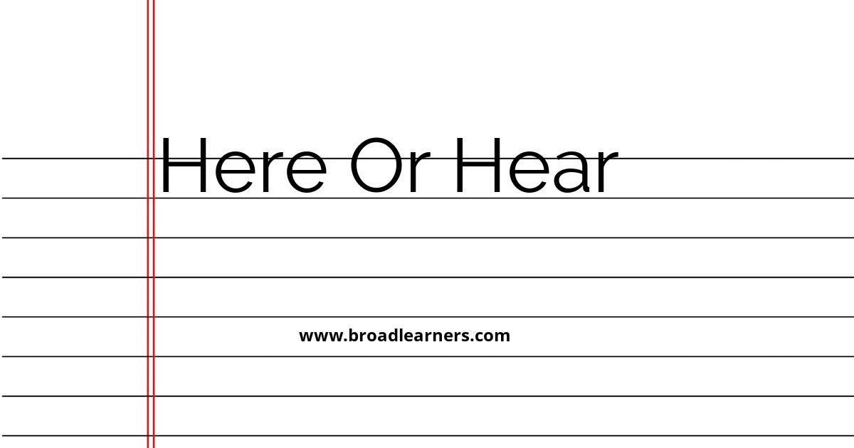 | The word 'here' refers to a specific location or position. | The word 'hear' means to perceive sounds with the ears. |