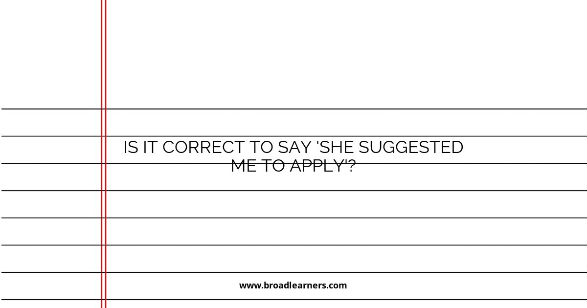 So, is it correct to say “She suggested me to apply”? No, it isn’t. While the sentence may seem logical, it does not follow standard English grammar rules.